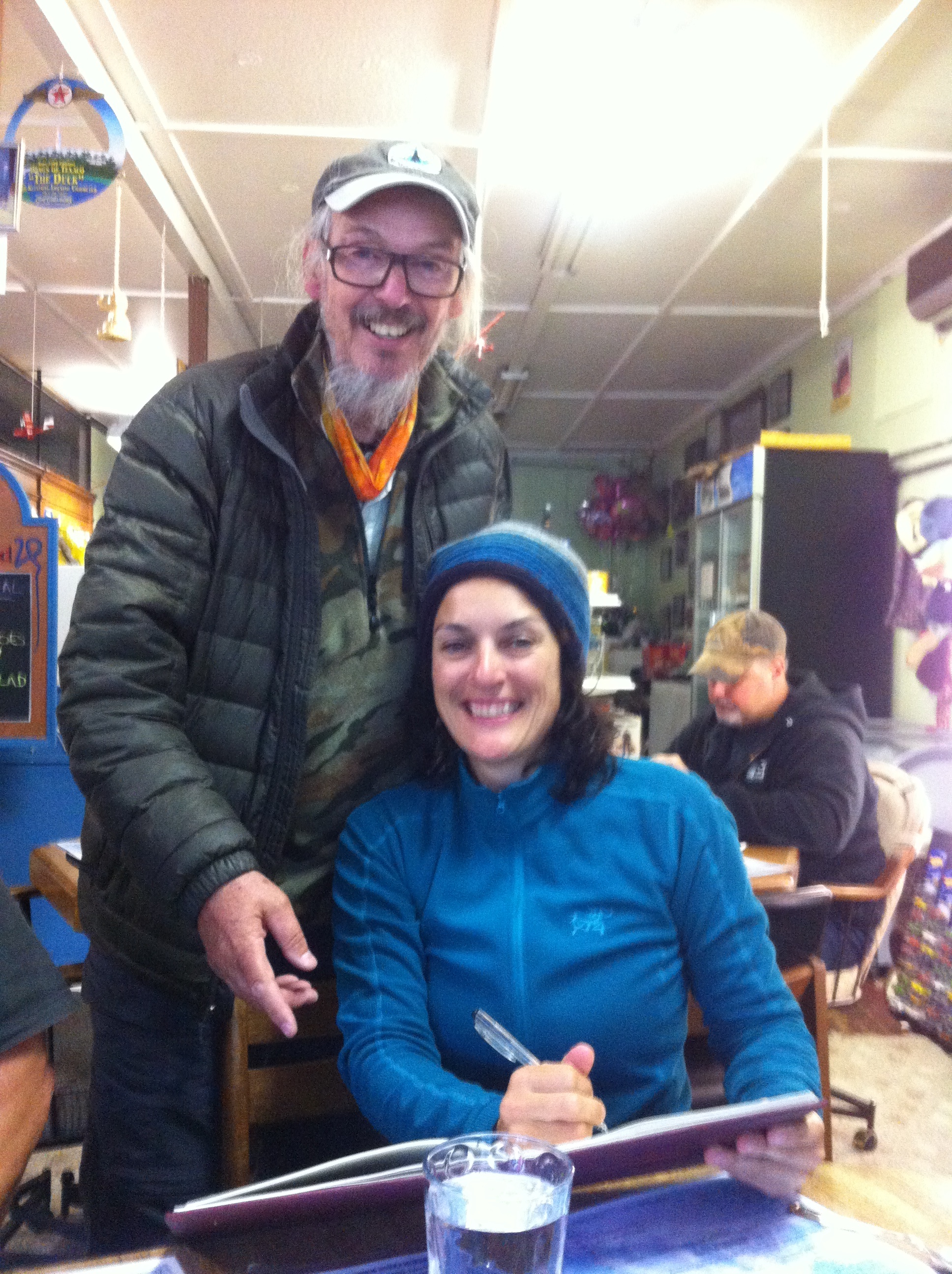 With Edward in The Baring Store, Skykomish, having fun writing in the restaurant’s register.