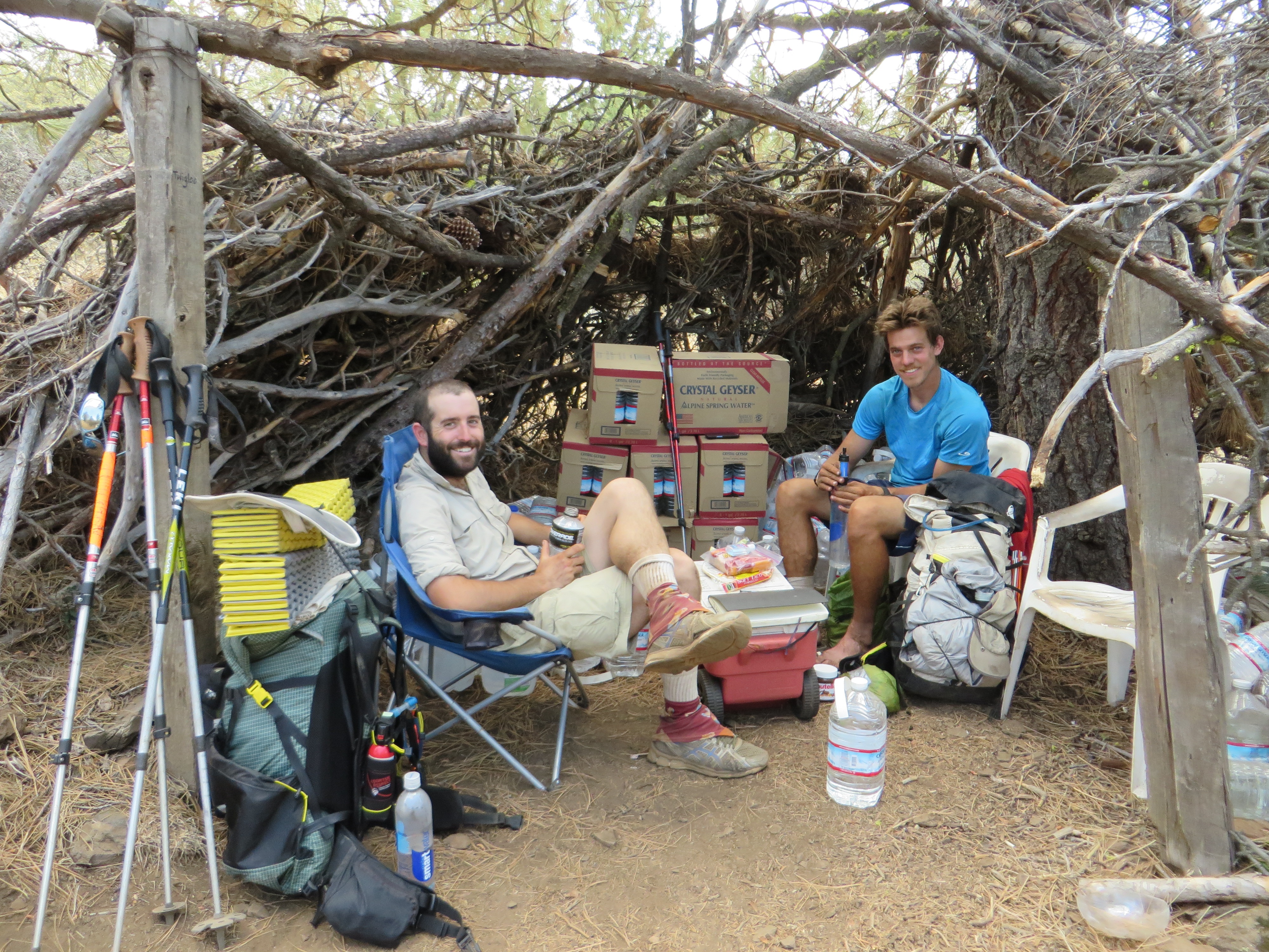 It’s amazing. Trail angels made an awesome hut out of tree branches and stocked the hut with gallons and gallons of water. Bless them, I feel so grateful that they do all this work for the hikers. I sign the register with a big thank you and I’m on my way again. It’s past 2pm, I’m setting out on the hottest time of day.