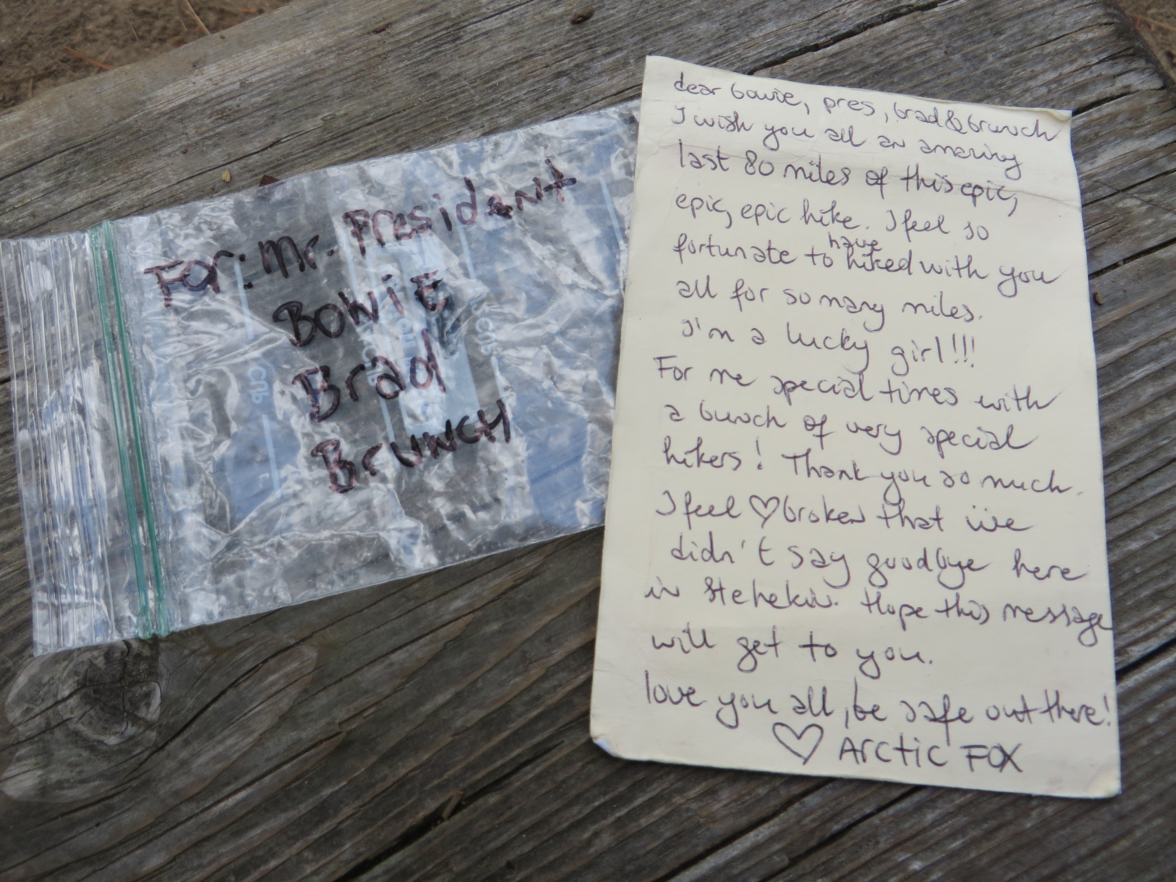 I hike out by myself. I decide to write my friends a note which I leave it for them to find at Bridge Creek, sealed in a ziplock bag, with a stone on top.