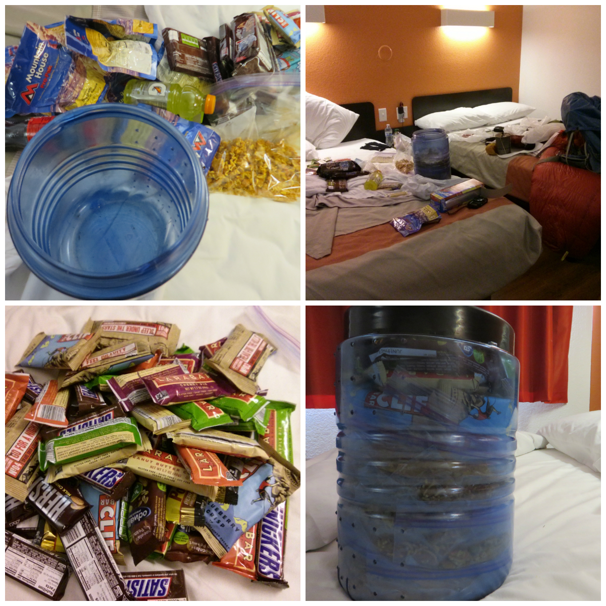 collage_routehighsierrasThe reason why I do this: the High Sierras are just not to be taken lightly. Especially not in this late season, where the risk of getting stuck in a snow storm has increased. In the next 212 miles, the trail runs over 8 mountain passes, each between 11000 and 13000 feet in elevation. And I have to climb them all. So I’m in a hurry and I want to get over the High Sierras as soon as I can. Because of the higher elevation, my body will need more energy to keep performing. So I need to take more food with me. I have to carry food and fuel for about 11 days. Which will be heavier than anything I carried before throughout my hike. The next problem arises. I have to fit all this food in my bear canister. That is not going to be easy. I buy a crazy amount of power bars and Snickers, and freeze dried meals, which I repack into small ziplock bags (less weight than the packaging Mountain House uses for their meals). I have to literally sit on top of the bear canister to get it all in there, but finally it works! I’m ready to go. My pack weights more than half of my own body weight.